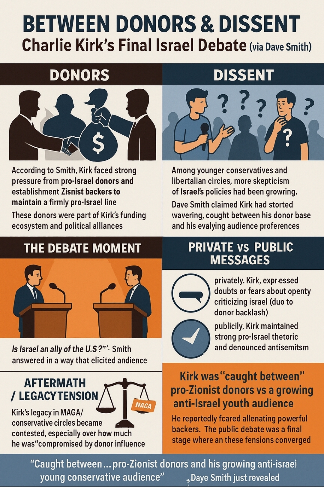 • Reports of heavy donor pressure (e.g., from billionaire allies) align with Smith’s sense that Kirk felt squeezed after hosting Israel-skeptical voices.