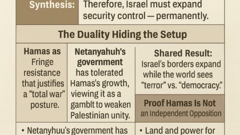 This article argues that Hamas often functions less as an independent representative of Palestinians and more as a foil that stabilizes Israeli hard-line policy and outside political agendas. In a classic Hegelian dialectic—thesis, antithesis, synthesis—Hamas provides the spectacle and violence (antithesis) that make a preselected outcome (expanded control, permanent “security” structures, and land consolidation—the synthesis) … Continue reading Controlled Opposition: How Hamas Serves the Hegelian Dialectic in Gaza