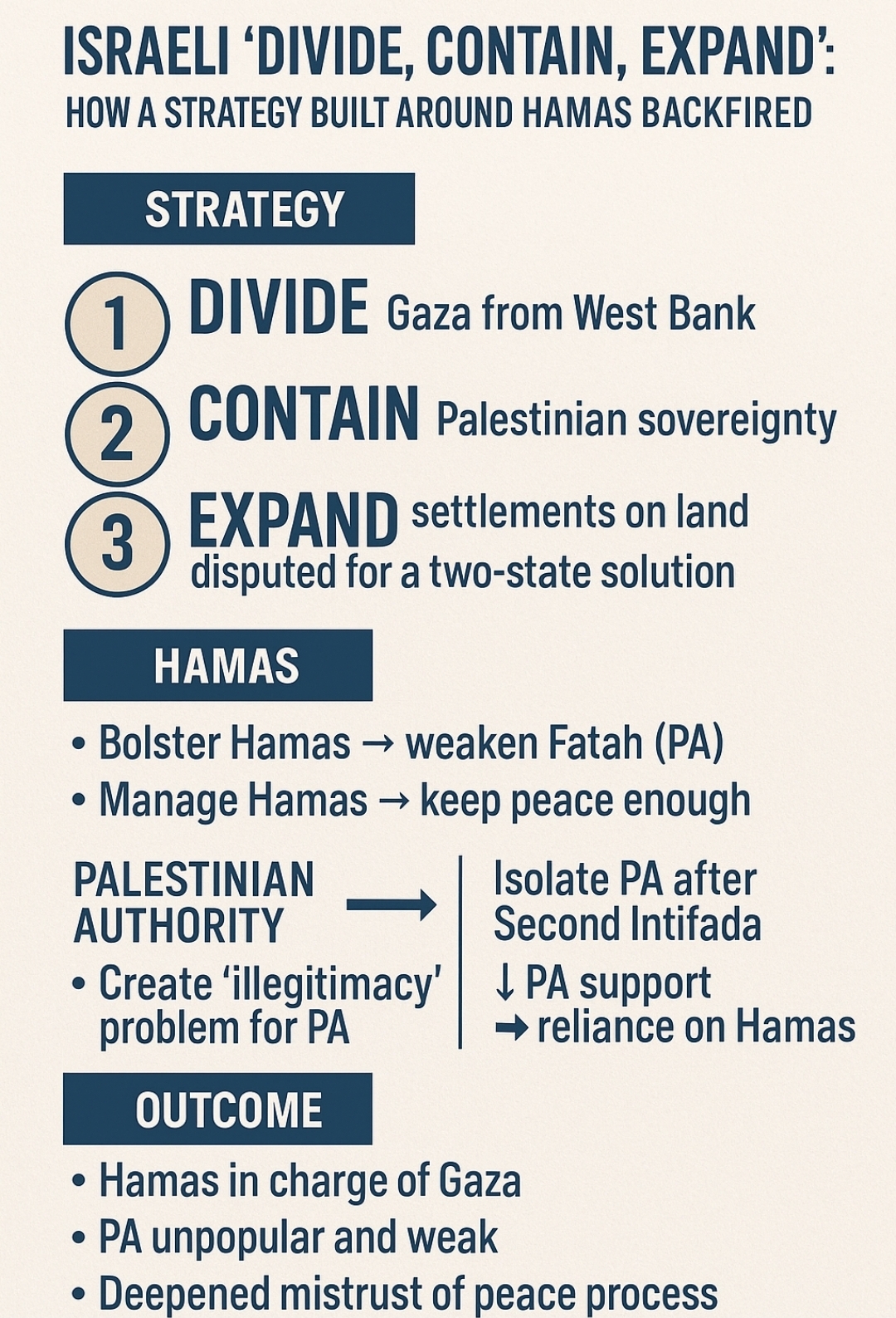 - Result: This “divide & contain” approach appeared to “work” tactically, but failed strategically, as shown by the Oct. 7, 2023 Hamas attack, which devastated Israeli security and inflicted mass suffering on civilians on both sides.