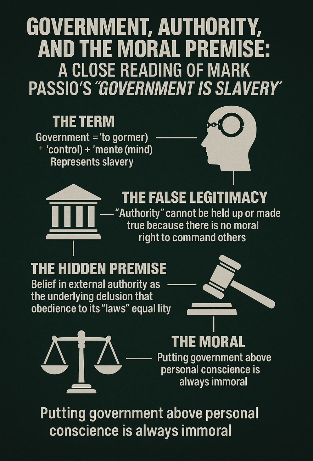 The cornerstone claim is stark: the human condition is slavery. Not the historical image of chains and auctions, but a subtler, more pervasive form: covert slavery. The instrument of this slavery, Passio argues, is government, and the psychic mechanism that sustains it is the belief in authority.