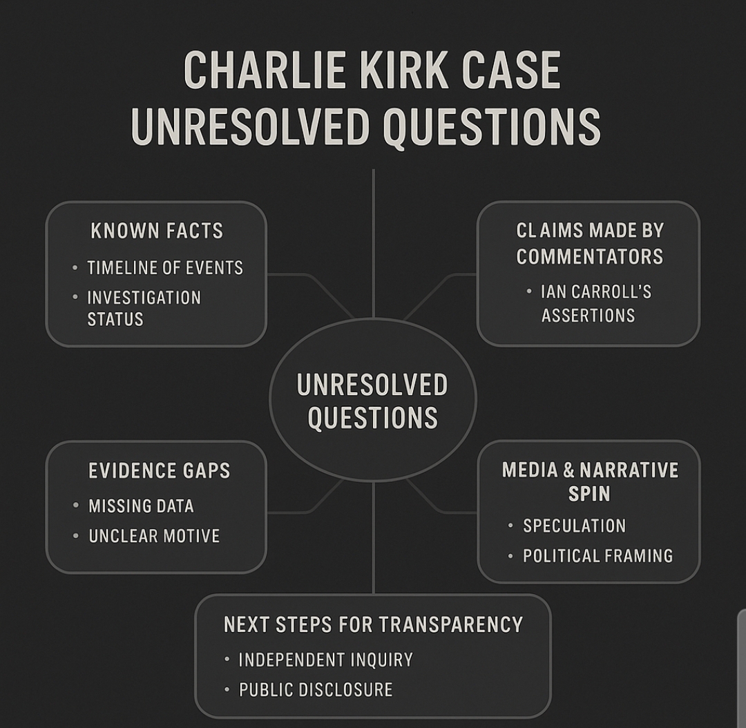 Everything above is a faithful, neutral summary of what your transcript says people alleged or argued—not independent verification. Public accusations that a specific person, government, or service committed a murder require hard proof. The clip itself acknowledges that key links (money, comms, handlers, tasking) have not been shown. If you want, I can draft a short, concrete list of disclosures an investigator or oversight committee should compel (device forensics, CCTV pulls, ballistic chain of custody, donor contact logs, etc.) so the conversation moves from speculation to facts.
