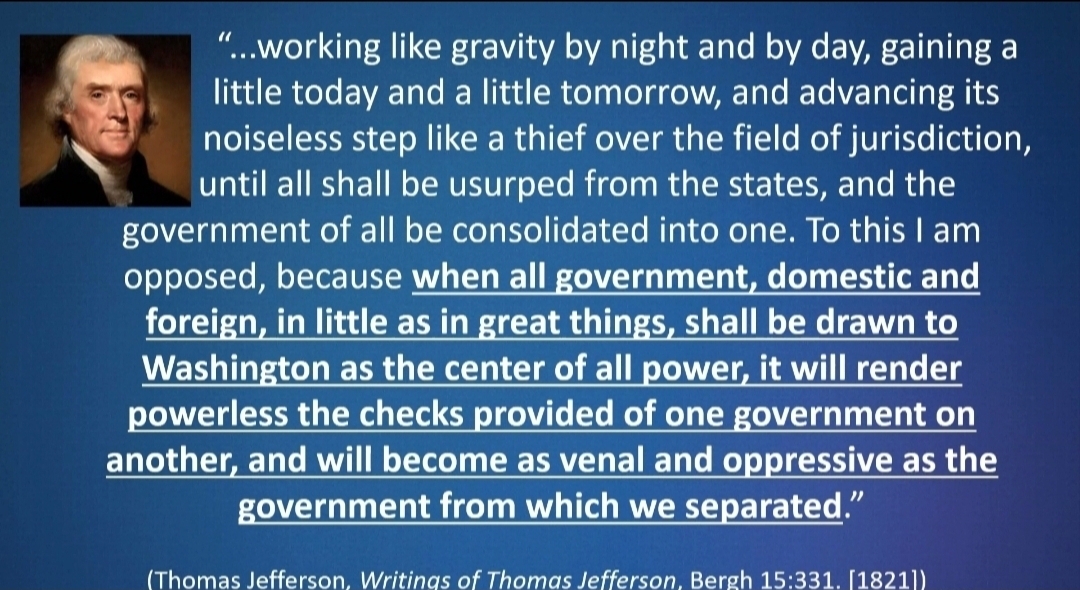 It is by dividing and subdividing these republics from the great national one down through all its subordinations, until it ends in the administration of every man’s farm by himself; by placing under every one what his own eye may superintended, that all will be done for the best.” – Thomas Jefferson (Letter to Josephs C. Cabell Letters, p.1388. 1816)