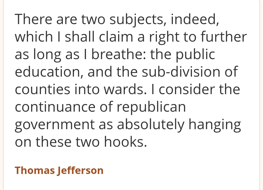 He said it in different keys. In his paeans to the yeoman he praised independence of livelihood because it underwrote independence of mind. In schemes for “ward republics” he tried to miniaturize the republic into units small enough for every person to see and touch: a school, a constable, a jury, a road crew, a militia company—governance you could meet on Tuesday night. Even his famous push for public education was not primarily a national project; it was a local one meant to cultivate citizens capable of judging those who would govern them. Running through it all was a simple instinct: liberty dilutes when power aggregates.