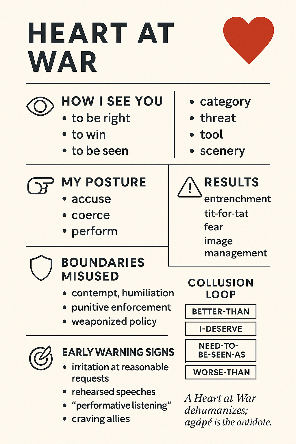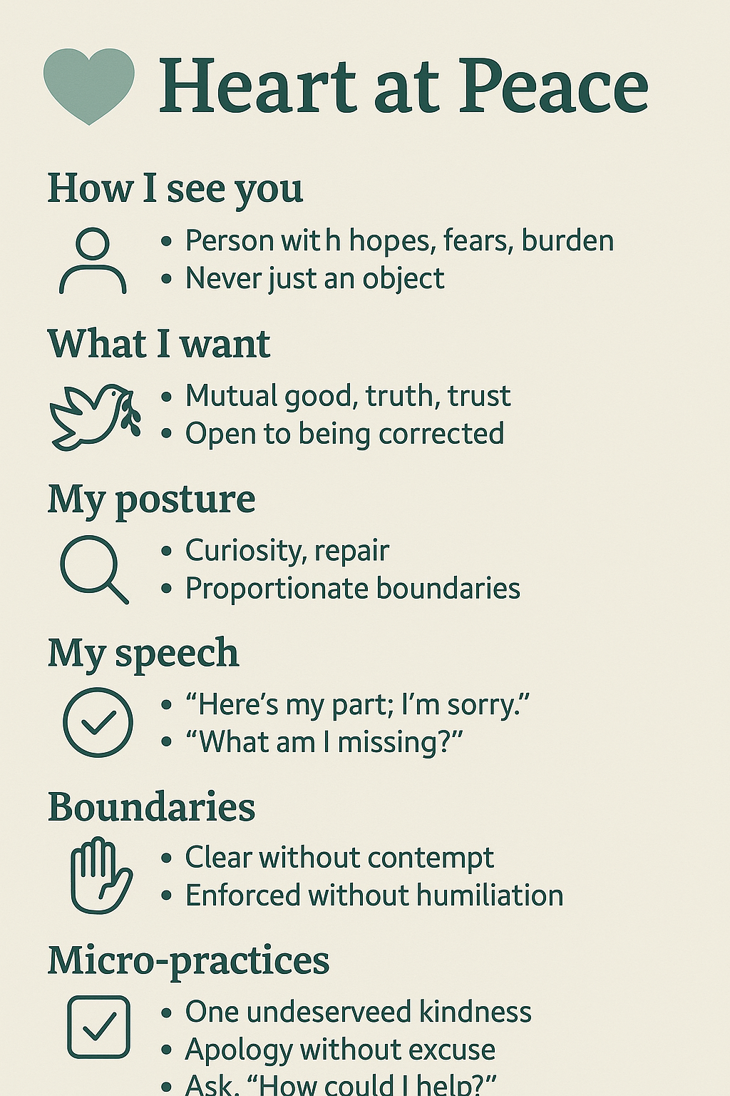 A Heart at War makes enemies even out of those we love and serve, and turns every tool into a weapon of self-justification. A Heart at Peace begins with seeing—persons, not props—then acting for their good with truthful boundaries. Techniques follow stance; outcomes follow sight. Peace scales when leaders go first.