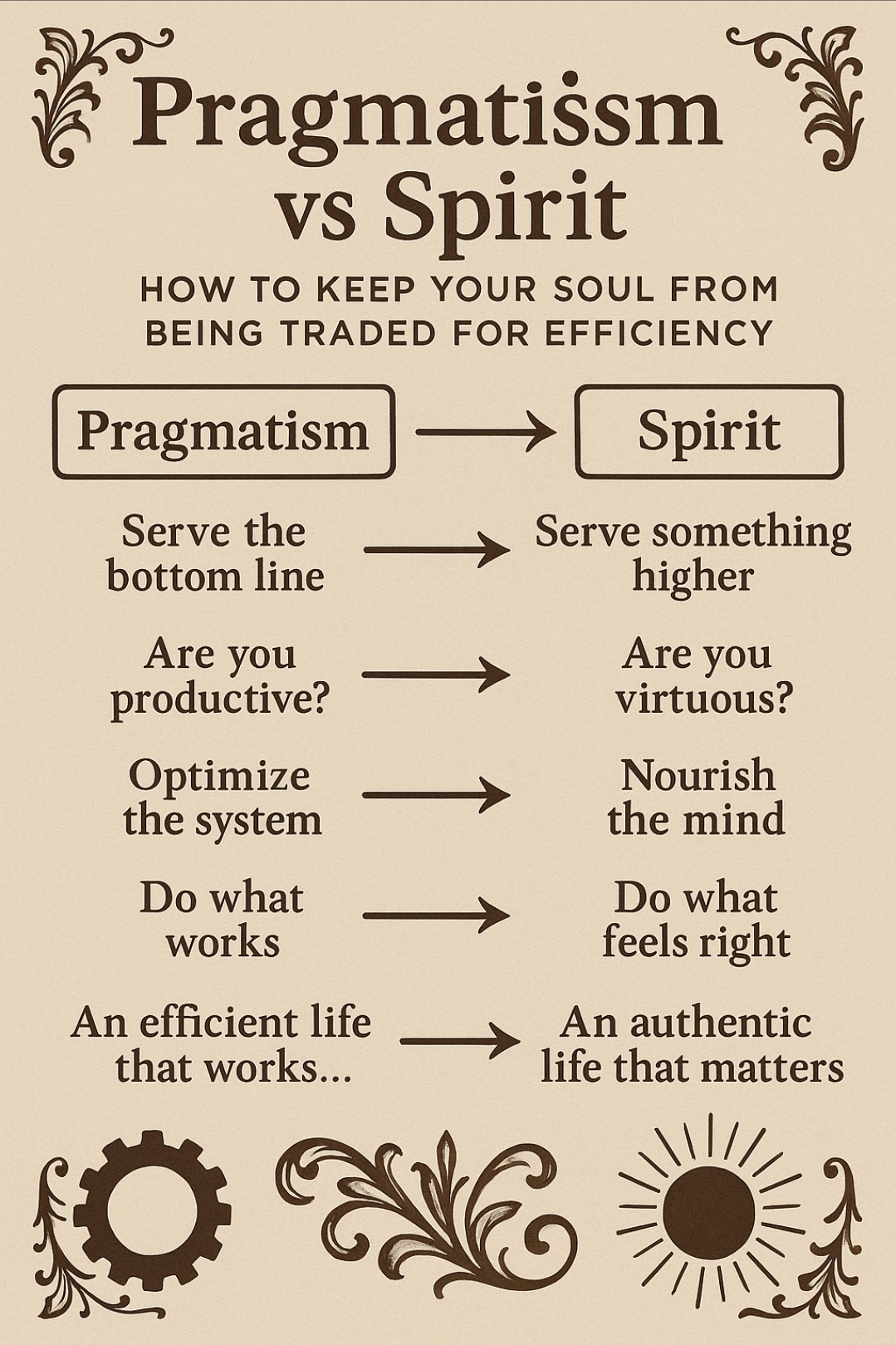 Pragmatism is a good servant but a terrible god. Spirituality must remain first, or the soul will be traded away in tiny compromises. When you live from spirit, you don’t dismiss practicality — you sanctify it, bending it toward higher ends.