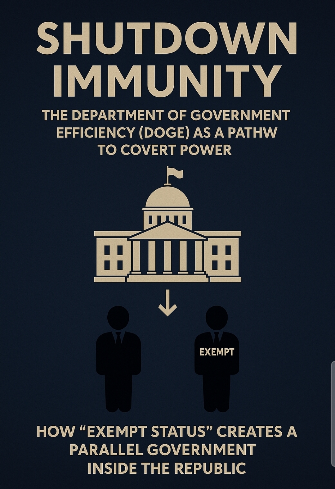 Understanding DOGE’s “shutdown immunity” isn’t a bureaucratic curiosity; it’s a glimpse into how governance itself is being rewritten. Each exemption, each algorithmic decision, each hidden AI audit represents a transfer of sovereignty — from elected accountability to machine logic, from the republic to the technocracy.