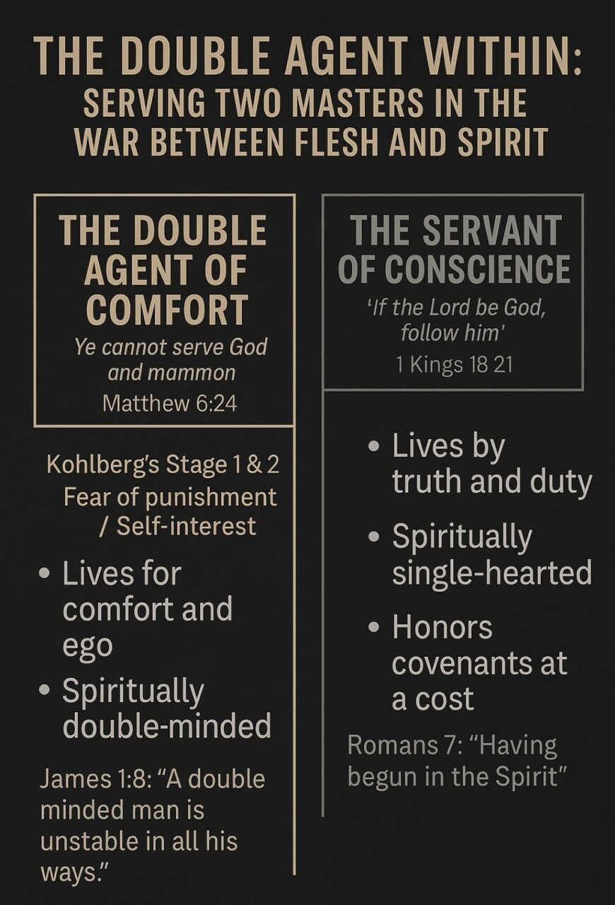 The spiritual double agent wears the uniform of faith but carries the weapons of the flesh. They profess loyalty to truth, yet their allegiance changes with social pressure, profit, or pleasure. They pray for guidance, but choose convenience. They speak of God, but live for comfort. They appear faithful, but every decision is negotiated through the question: