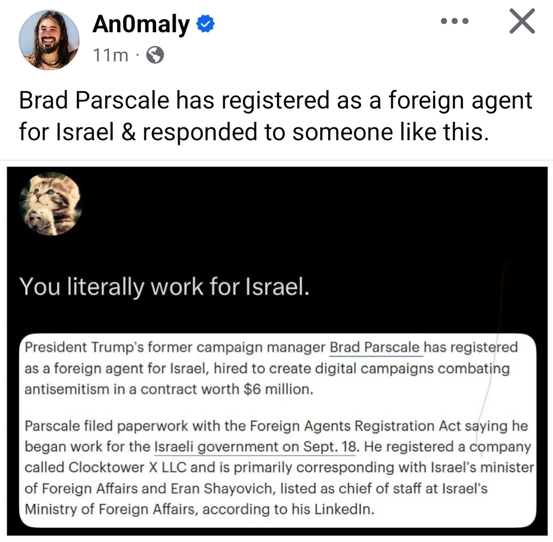 An0maly recently posted on Facebook about Brad Parscale — former campaign manager for Donald Trump — now officially registered as a foreign agent for Israel.
